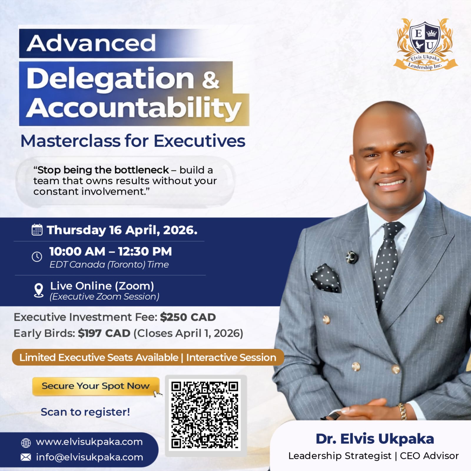 One-Hour Leadership Masterclass Training Purpose The purpose of this masterclass is to equip business owners and executives with practical strategies to delegate effectively, build accountability systems, and free up time to focus on high-value leadership priorities. Participants will learn how